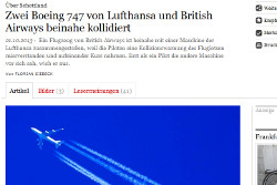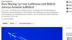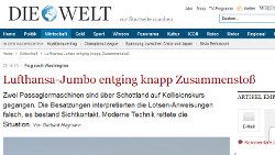 Dennoch: Überschriften wie »Lufthansa Jumbo entging knapp Zusammenstoß« (DIE WELT) oder »Zwei Boeing 747 (…) beinahe kollidiert« (FAZ) zielen darauf ab, ein Maximum an Schrecken aus der ernstzunehmenden, aber systematisch (also nicht durch Glück oder Zufall) gelösten Situation zu gewinnen. Und der Untertitel »Nur noch 30 Meter Höhenunterschied« lässt Bilder von sich schreckensbleich zuwinkenden Menschen an Bord der beiden Großraumjets im Kopf entstehen. Eine Boeing 747 in sieben Kilometer Entfernung hat jedoch nur etwas mehr als die Größe eines Vollmonddurchmessers.