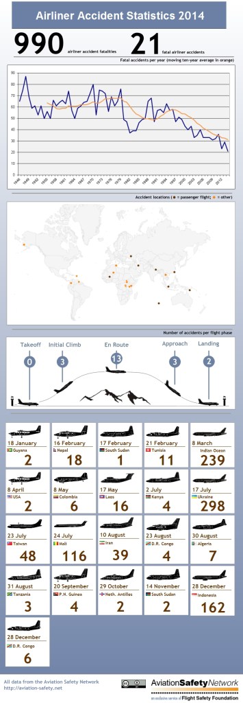 Fakt ist: 2014 gab es nicht mehr tödliche Unfälle mit Verkehrsflugzeugen als in den bisher besten Jahren seit 1945, 2012 und 2013, sondern weniger. Den betroffenen Angehörigen der leider dennoch zahlreichen Opfer ist das natürlich kein Trost, und keineswegs sollen hier die tragischen Unglücke der letzten Monate verharmlost oder bagatellisiert werden.